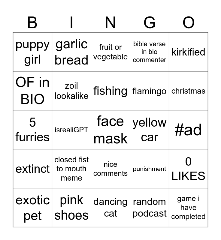 This bingo card has a free space and 24 words: closed fist to mouth meme, pink shoes, fishing, exotic pet, kirkified, puppy girl, OF in BIO, garlic bread, yellow car, nice comments, flamingo, 5 furries, punishment, 0 LIKES, zoil lookalike, random podcast, #ad, fruit or vegetable, christmas, isrealiGPT, game i have completed, extinct, bible verse in bio commenter and dancing cat.