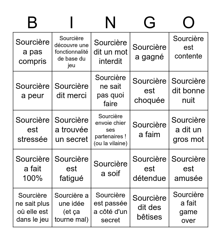 This bingo card has a free space and 24 words: Sourcière est fatigué, Sourcière a une idée (et ça tourne mal), Sourcière ne sait pas quoi faire, Sourcière ne sait plus où elle est dans le jeu, Sourcière est contente, Sourcière a pas compris, Sourcière a peur, Sourcière découvre une fonctionnalité de base du jeu, Sourcière a faim, Sourcière a soif, Sourcière est choquée, Sourcière est stressée, Sourcière est détendue, Sourcière est amusée, Sourcière dit merci, Sourcière dit des bêtises, Sourcière a dit un gros mot, Sourcière dit un mot interdit, Sourcière dit bonne nuit, Sourcière a trouvée un secret, Sourcière a fait game over, Sourcière a fait 100%, Sourcière a gagné and Sourcière est passée a côté d'un secret.