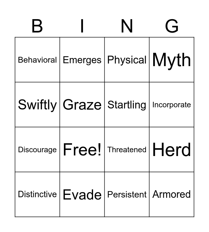 This bingo card has 18 words: Free!, Armored, Physical, Behavioral, Threatened, Myth, Distinctive, Emerges, Incorporate, Discourage, Persistent, Swiftly, Herd, Graze, Startling, Concealing, Evade and Probing.
