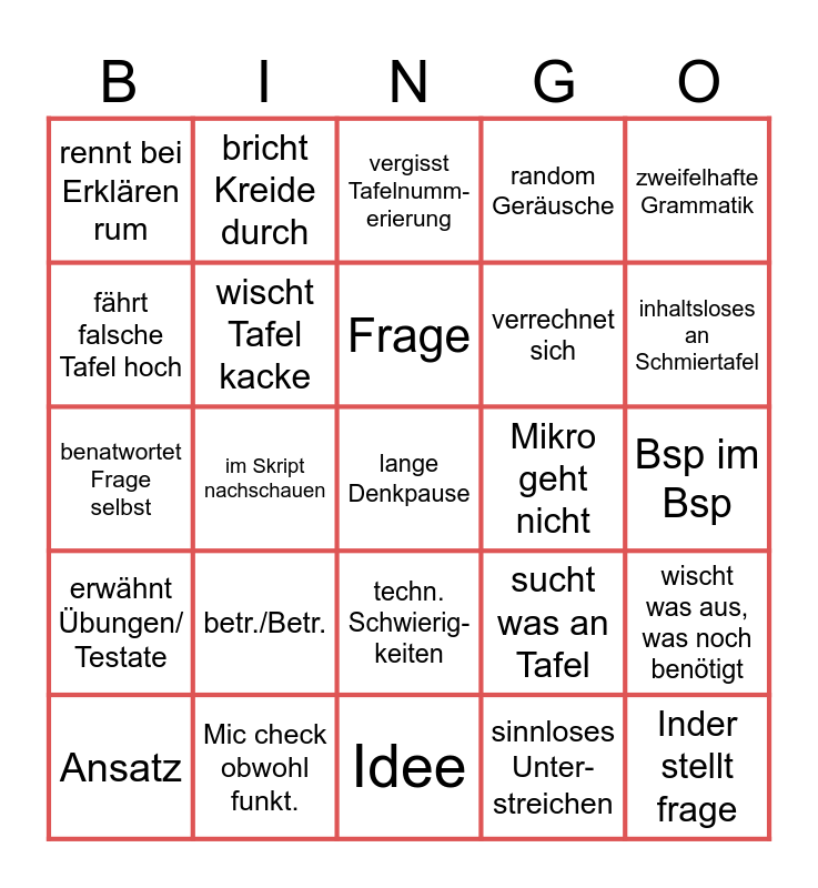 This bingo card has 25 words: betr./Betr., Idee, Frage, Ansatz, zweifelhafte Grammatik, rennt bei Erklären rum, fährt falsche Tafel hoch, bricht Kreide durch, Mikro geht nicht, techn. Schwierig- keiten, verrechnet sich, benatwortet Frage selbst, sucht was an Tafel, wischt was aus, was noch benötigt, wischt Tafel kacke, Inder stellt frage, Bsp im Bsp, vergisst Tafelnumm- erierung, inhaltsloses an Schmiertafel, im Skript nachschauen, lange Denkpause, Mic check obwohl funkt., erwähnt Übungen/ Testate, random Geräusche and sinnloses Unter-streichen.