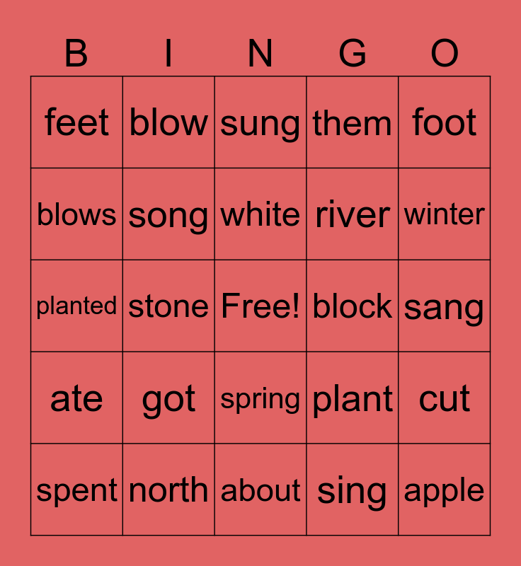 This bingo card has a free space and 24 words: got, north, white, spent, foot, feet, blows, blow, block, spring, river, planted, plant, cut, song, sing, sang, sung, winter, stone, apple, ate, them and about.