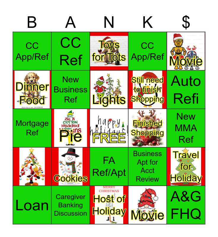 This bingo card has 12 images, a free space and 23 words: Cookies, Caregiver Banking Discussion, Lights, Loan, Movie, CC App/Ref, Dinner Food, CC Ref, Finished Shopping, FA Ref/Apt, Still need to finish Shopping, Mortgage Ref, Business Apt for Acct Review, Travel for Holiday, New Business Ref, Movie, New MMA Ref, Toys for Tots, Auto Refi, Pie, A&G FHQ, CC App/Ref and Host of Holiday.