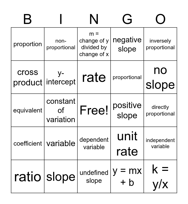 This bingo card has a free space and 25 words: ratio, variable, rate, y = mx + b, no slope, proportion, non-proportional, m = change of y divided by change of x, proportional, independent variable, equivalent, y-intercept, unit rate, k = y/x, cross product, slope, undefined slope, negative slope, directly proportional, coefficient, constant of variation, dependent variable, positive slope, inversely proportional and Variables, expressions, equations, inequalities, solutions, slope, y-intercept, proportional relationships, graphs, tables, rate.