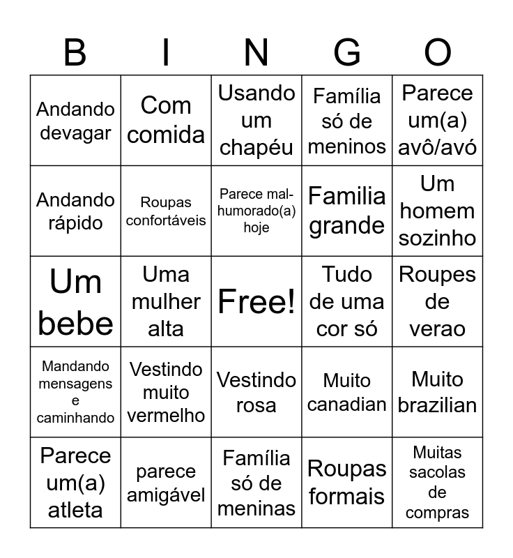 This bingo card has a free space and 24 words: Vestindo muito vermelho, parece amigável, Parece mal-humorado(a) hoje, Parece um(a) atleta, Parece um(a) avô/avó, Andando devagar, Andando rápido, Com comida, Tudo de uma cor só, Vestindo rosa, Familia grande, Um bebe, Muito canadian, Muito brazilian, Roupas confortáveis, Roupas formais, Roupes de verao, Usando um chapéu, Um homem sozinho, Uma mulher alta, Muitas sacolas de compras, Mandando mensagens e caminhando, Família só de meninos and Família só de meninas.