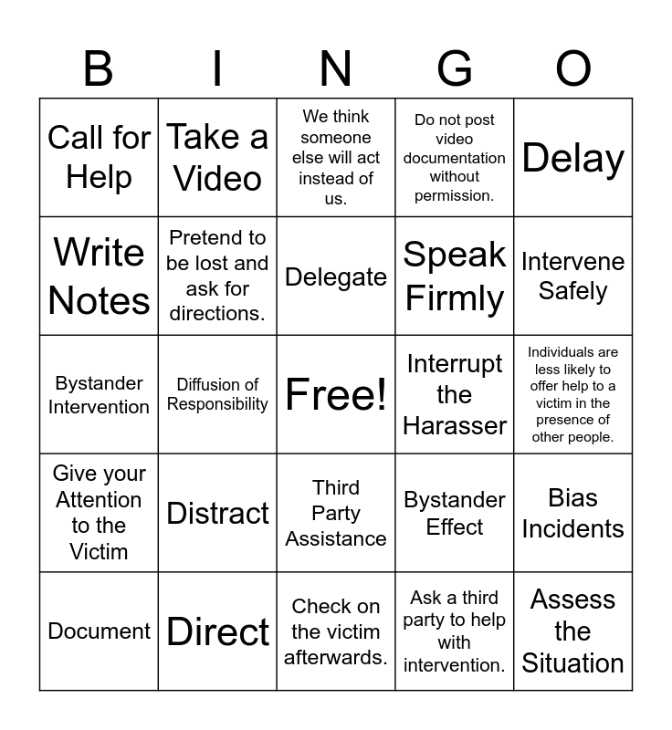 This bingo card has a free space and 24 words: Distract, Direct, Delegate, Document, Delay, Call for Help, Write Notes, Take a Video, Interrupt the Harasser, Third Party Assistance, Speak Firmly, Bystander Intervention, Bystander Effect, Bias Incidents, Pretend to be lost and ask for directions., Ask a third party to help with intervention., Individuals are less likely to offer help to a victim in the presence of other people., We think someone else will act instead of us., Intervene Safely, Diffusion of Responsibility, Assess the Situation, Give your Attention to the Victim, Do not post video documentation without permission. and Check on the victim afterwards..