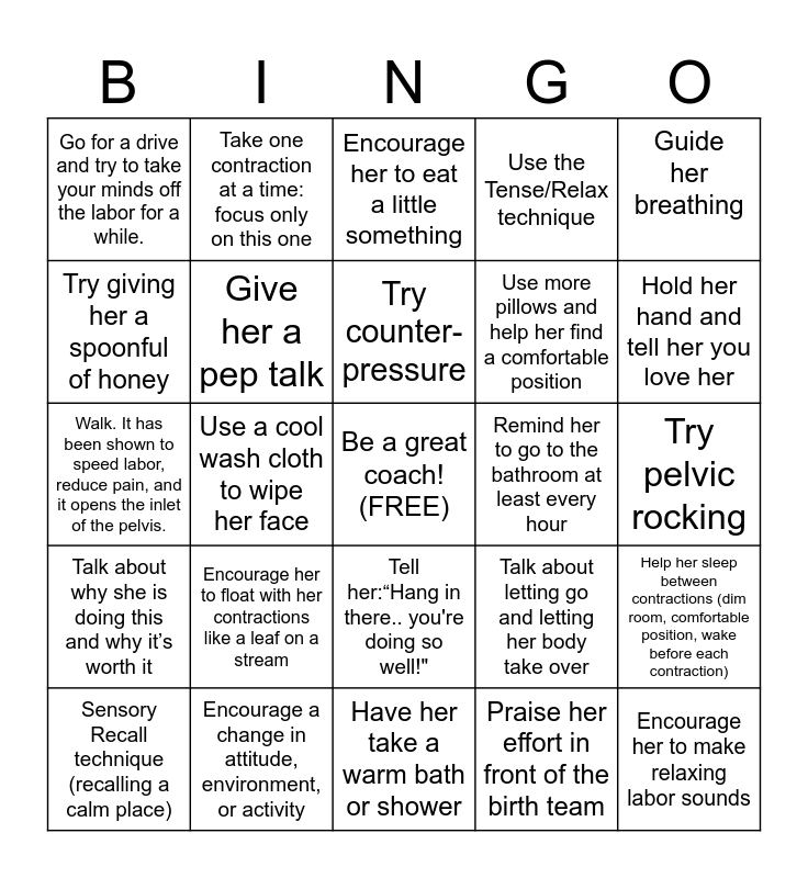 This bingo card has a free space and 24 words: Encourage her to float with her contractions like a leaf on a stream, Encourage a change in attitude, environment, or activity, Try counter-pressure, Sensory Recall technique (recalling a calm place), Guide her breathing, Go for a drive and try to take your minds off the labor for a while., Try giving her a spoonful of honey, Take one contraction at a time: focus only on this one, Remind her to go to the bathroom at least every hour, Tell her:“Hang in there.. you're doing so well!", Use more pillows and help her find a comfortable position, Walk. It has been shown to speed labor, reduce pain, and it opens the inlet of the pelvis., Talk about letting go and letting her body take over, Help her sleep between contractions (dim room, comfortable position, wake before each contraction), Give her a pep talk, Praise her effort in front of the birth team, Try pelvic rocking, Encourage her to eat a little something, Hold her hand and tell her you love her, Use a cool wash cloth to wipe her face, Encourage her to make relaxing labor sounds, Talk about why she is doing this and why it’s worth it, Use the Tense/Relax technique and Have her take a warm bath or shower.