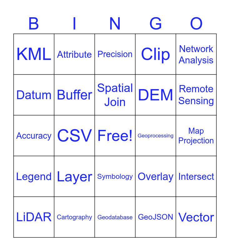 This bingo card has a free space and 49 words: Raster, Vector, Shapefile, Geodatabase, Layer, Feature, Attribute, Projection, Datum, Coordinate System, Buffer, Clip, Intersect, Overlay, Dissolve, Union, Spatial Join, Geoprocessing, Topology, Network Analysis, CSV, GeoJSON, KML, DEM, TIN, Remote Sensing, LiDAR, Metadata, Symbology, Legend, Scale, North Arrow, Extent, Basemap, Cartography, Choropleth, Heatmap, Georeferencing, Map Projection, ArcGIS, QGIS, GPS, Geocoding, Spatial Resolution, Accuracy, Precision, Coordinate Pair, WGS84 and UTM.