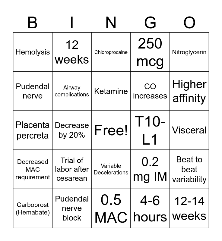 This bingo card has a free space and 39 words: Delayed gastric emptying & ↓ LES tone Phenylephrine, Pitocin (Oxytocin), ≥70,000, Airway complications, Carboprost (Hemabate), Variable Decelerations, Ketamine, Calcium gluconate, Nitroglycerin, Decreased MAC requirement, Decrease by 20%, 250 mcg, 12-14 weeks, Visceral, T10-L1, Trial of labor after cesarean, 150,000 - 450,000, Hemolysis, Bezold-Jarisch Reflex, 0.2 mg IM, Pudendal nerve, 0.5 MAC, CO increases, Higher affinity, 20 weeks, Placenta previa, Abruptio placenta, Uterine atony, T4, 12 weeks, Immediately after delivery, 2; 1, Chloroprocaine, Pudendal nerve block, 4-6 hours, Post dural puncture headache, Beat to beat variability, Placenta percreta and Second trimester.