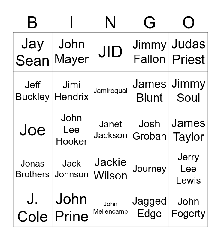 This bingo card has a free space and 57 words: The Jackson 5, J. Cole, Jeremih, Jay Sean, John Mellencamp, Jethro Tull, Jimi Hendrix, J. Holiday, James Blunt, Joan Jett & the Blackhearts, Jimmy Fallon, Jesse McCartney, Jimmy Dean, Jimmy Eat World, JAY-Z, Jack White, Judas Priest, John Lee Hooker, Joe Walsh, John Fogerty, Josh Groban, Junior Senior, Journey, JID, Jesus Jones, Jamiroquai, Jim James, Jodeci, Jimmy Soul, Jefferson Starship, The J. Geils Band, Jet, John Legend, Jack's Mannequin, James Taylor, Jeff Buckley, John Travolta, Joe, Johann Sebastian Bach, Jonas Brothers, John Mayer, Jackie Wilson, J-Kwon, Joey Valence & Brae, Jim Jones, Jess Glynne, Jack Johnson, John Prine, Jermaine Dupri, Jamie Foxx, Johnny Cash, Jagged Edge, Jars Of Clay, Jason Derulo, Jennifer Hudson, Jerry Lee Lewis and Jo Dee Messina.