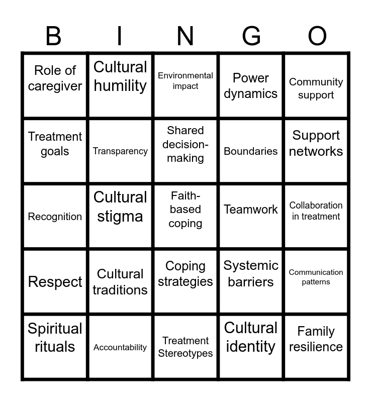 This bingo card has a free space and 24 words: Cultural traditions, Accountability, Shared decision-making, Spiritual rituals, Community support, Role of caregiver, Treatment goals, Cultural humility, Teamwork, Coping strategies, Boundaries, Recognition, Systemic barriers, Communication patterns, Transparency, Cultural identity, Collaboration in treatment, Environmental impact, Support networks, Cultural stigma, Family resilience, Respect, Power dynamics and Treatment Stereotypes.