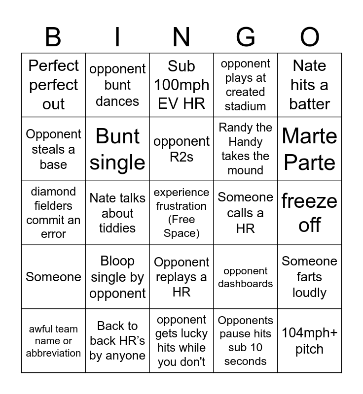 This bingo card has a free space and 24 words: Bloop single by opponent, Back to back HR’s by anyone, opponent R2s, awful team name or abbreviation, Nate hits a batter, Perfect perfect out, Opponent steals a base, opponent bunt dances, Someone calls a HR, Opponent replays a HR, Randy the Handy takes the mound, diamond fielders commit an error, opponent dashboards, Someone farts loudly, Bunt single, Opponents pause hits sub 10 seconds, freeze off, Sub 100mph EV HR, Marte Parte, Nate talks about tiddies, 104mph+ pitch, Someone, opponent plays at created stadium and opponent gets lucky hits while you don't.