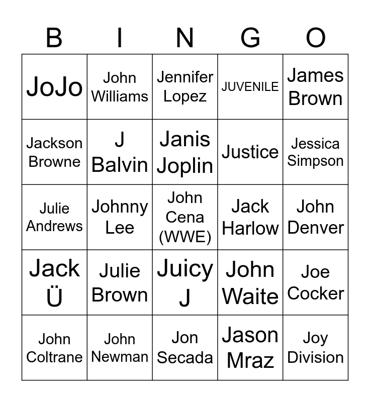 This bingo card has a free space and 57 words: Joe Budden, John Coltrane, John Michael Montgomery, JoJo, Jon Secada, Jordin Sparks, J Balvin, Japanese Breakfast, Justice, Justin Timberlake, JUVENILE, Jadakiss, Juice WRLD, Jeezy, Jim Croce, Jimmy Buffett, James Brown, Johnny Lee, Joey Bada$$, Joy Division, Jack Harlow, Jessie J, John Waite, Jennifer Lopez, Ja Rule, Janis Joplin, Jewel, JT Money, Jessica Simpson, Justin Bieber, Jimmie's Chicken Shack, Jay Rock, Jane's Addiction, John Lennon, John Denver, Jackson Browne, Jhené Aiko, Julie Andrews, Jessie Murph, Jack Ü, John Williams, Juicy J, Jefferson Airplane, Juelz Santana, James Gang, JVKE, Julie Brown, John Newman, Jedi Mind Tricks, Jungle, Jimmy Cliff, Jason Mraz, Jelly Roll, Jill Scott, The Judds, Joe Cocker and Joni Mitchell.