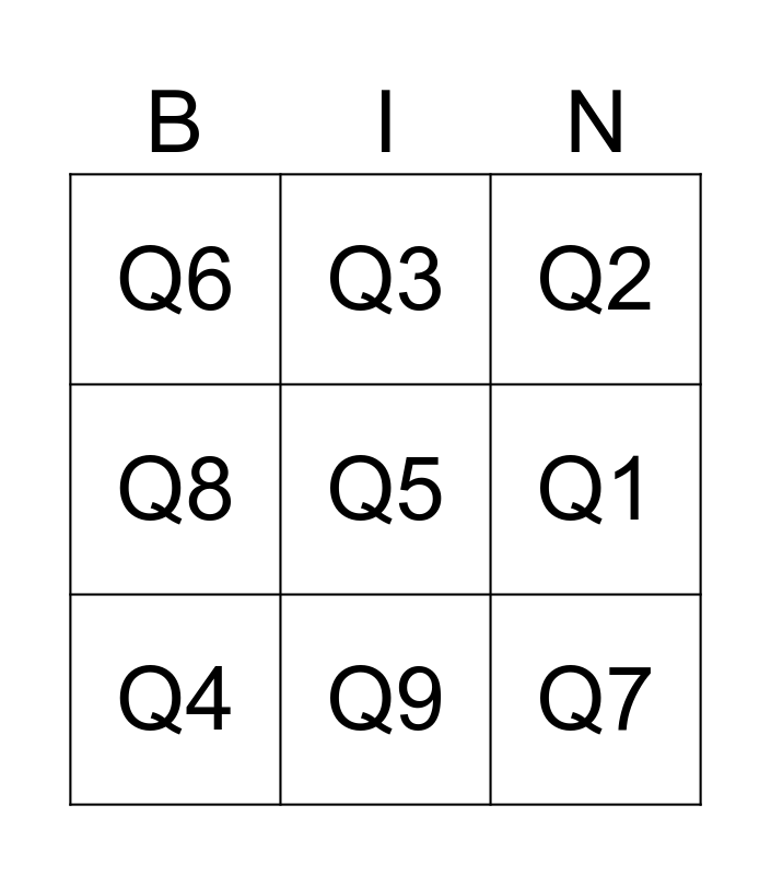 This bingo card has a free space and 8 words: Q1, Q2, Q3, Q4, Q6, Q7, Q8 and Q9.