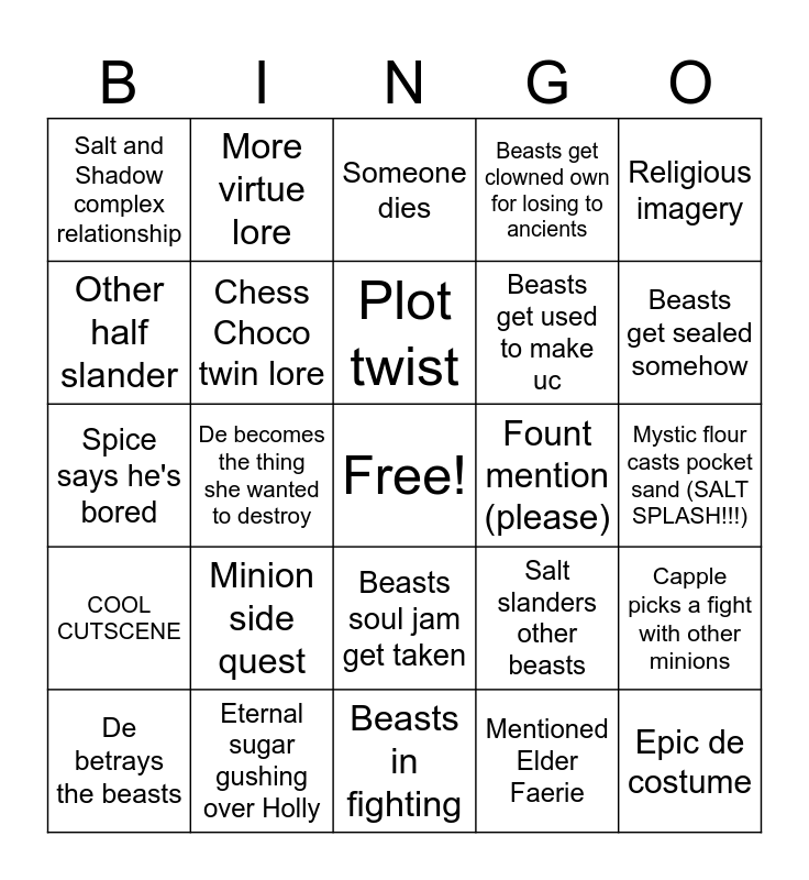 This bingo card has a free space and 24 words: Minion side quest, Eternal sugar gushing over Holly, Plot twist, De betrays the beasts, Religious imagery, Salt and Shadow complex relationship, Other half slander, More virtue lore, Fount mention (please), Beasts soul jam get taken, Beasts get used to make uc, Spice says he's bored, Salt slanders other beasts, Capple picks a fight with other minions, Chess Choco twin lore, Mentioned Elder Faerie, Mystic flour casts pocket sand (SALT SPLASH!!!), Someone dies, Beasts get sealed somehow, De becomes the thing she wanted to destroy, Epic de costume, COOL CUTSCENE, Beasts get clowned own for losing to ancients and Beasts in fighting.