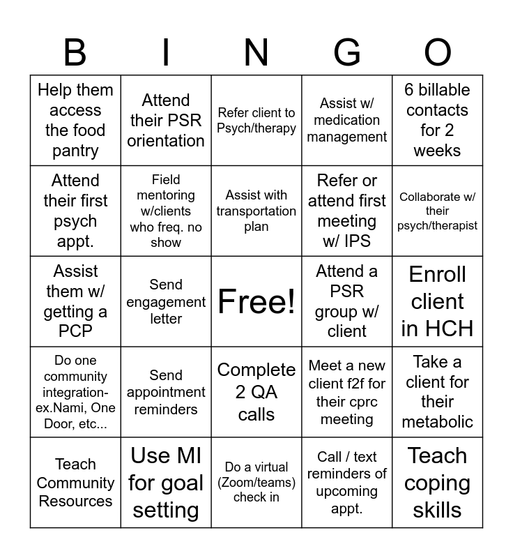 This bingo card has a free space and 24 words: Send appointment reminders, Use MI for goal setting, Assist with transportation plan, Teach Community Resources, 6 billable contacts for 2 weeks, Help them access the food pantry, Attend their first psych appt., Attend their PSR orientation, Attend a PSR group w/ client, Complete 2 QA calls, Refer or attend first meeting w/ IPS, Assist them w/ getting a PCP, Meet a new client f2f for their cprc meeting, Take a client for their metabolic, Field mentoring w/clients who freq. no show, Call / text reminders of upcoming appt., Enroll client in HCH, Refer client to Psych/therapy, Collaborate w/ their psych/therapist, Send engagement letter, Teach coping skills, Do one community integration-ex.Nami, One Door, etc..., Assist w/ medication management and Do a virtual (Zoom/teams) check in.