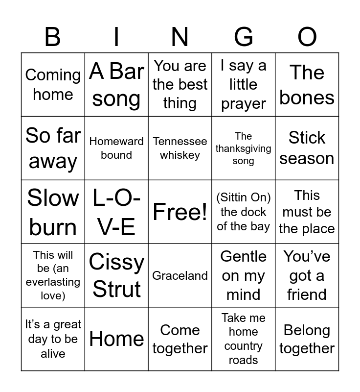 This bingo card has a free space and 60 words: Lovely day, Home, What a wonderful world, This will be (an everlasting love), Take me home country roads, Ain’t no mountain high enough, Homeward bound, Thank you for being a friend, The thanksgiving song, Better together, I say a little prayer, Easy, So far away, Here comes the sun, Stand by me, Coming home, Belong together, The bones, Gratitude, Tennessee whiskey, (Sittin On) the dock of the bay, You are the best thing, It’s a great day to be alive, You’ve got a friend, Our house, Sweet pea, Put your records on, Meanwhile back at mamas, Stick season, Holiday road, A change is gonna come, Mama said, I’ve got plenty to be thankful for, Signed sealed delivered, A Bar song, Take it easy, Be thankful, L-O-V-E, Crowded table, Slow burn, Let’s stay together, Cissy Strut, This must be the place, Better man, Gentle on my mind, Someone new, Feeling good, Autumn leaves, I can’t help myself, Graceland, Come together, Keep driving, Thankful, Family is family, Try a little tenderness, Ho Hey, The best is yet to come, Family table, We are family and Ain’t that love.