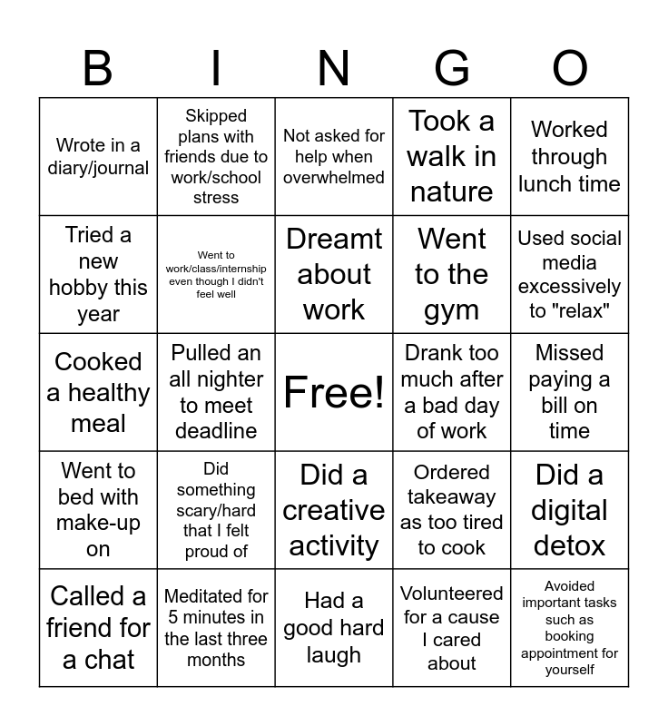 This bingo card has a free space and 24 words: Did something scary/hard that I felt proud of, Meditated for 5 minutes in the last three months, Dreamt about work, Called a friend for a chat, Worked through lunch time, Wrote in a diary/journal, Tried a new hobby this year, Skipped plans with friends due to work/school stress, Drank too much after a bad day of work, Did a creative activity, Went to the gym, Cooked a healthy meal, Ordered takeaway as too tired to cook, Did a digital detox, Went to work/class/internship even though I didn't feel well, Volunteered for a cause I cared about, Missed paying a bill on time, Not asked for help when overwhelmed, Used social media excessively to "relax", Pulled an all nighter to meet deadline, Avoided important tasks such as booking appointment for yourself, Went to bed with make-up on, Took a walk in nature and Had a good hard laugh.