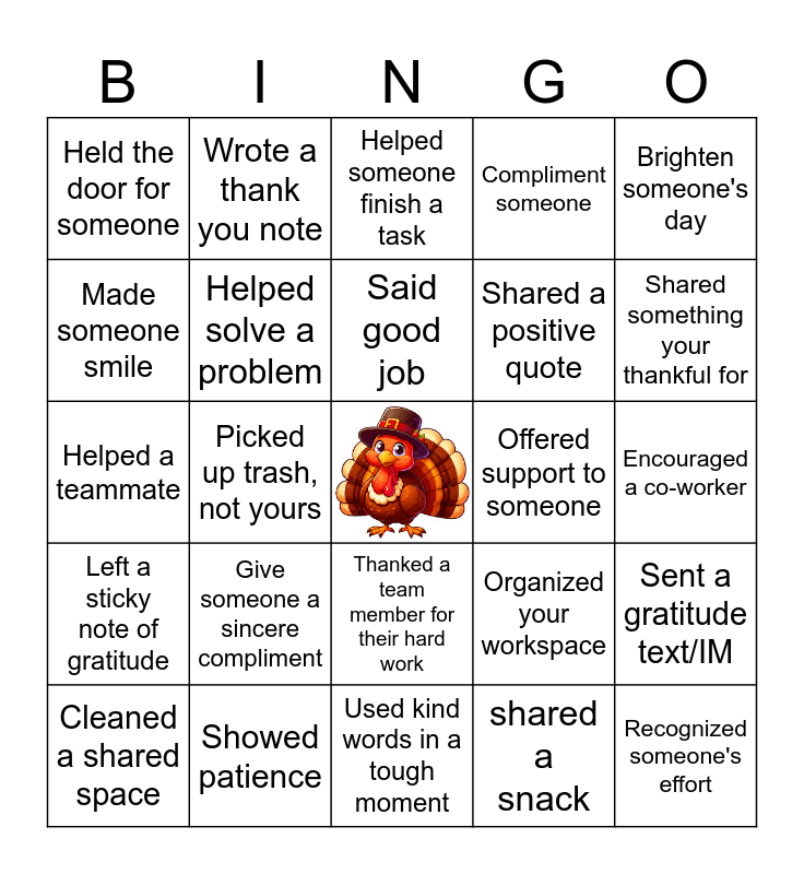 This bingo card has a free space and 24 words: Give someone a sincere compliment, Showed patience, Said good job, Cleaned a shared space, Brighten someone's day, Held the door for someone, Made someone smile, Wrote a thank you note, Offered support to someone, Thanked a team member for their hard work, Shared a positive quote, Helped a teammate, Organized your workspace, Sent a gratitude text/IM, Helped solve a problem, shared a snack, Encouraged a co-worker, Helped someone finish a task, Shared something your thankful for, Picked up trash, not yours, Recognized someone's effort, Left a sticky note of gratitude, Compliment someone and Used kind words in a tough moment.