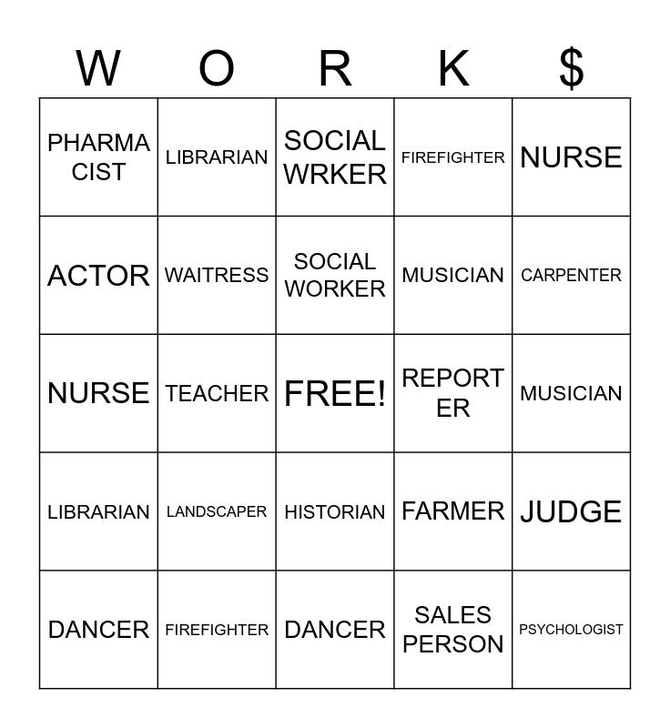 This bingo card has a free space and 48 words: SECRET ARY, PSYCHOLOGIST, CARPENTER, DANCER, LANDSCAPER, Store Worker, LIBRARIAN, Cook, ACTOR, MECHANIC, WAITRESS, FIREFIGHTER, JUDGE, FARMER, DOCTOR, POLICE OFFICER, SOCIAL WORKER, REPORT ER, CHILD CARE PROVIDER, NURSE, TEACHER, SALES PERSON, PHARMA CIST, MUSICIAN, PSYCHOLOGIST, CARPENTER, DANCER, LANDSCAPER, HISTORIAN, LIBRARIAN, COACH, ACTOR, MECHANIC, WAITRESS, FIREFIGHTER, SALESPERSON, PHARMACIST, MUSICIAN, JUDGE, FARMER, DOCTOR, POLICE OFFICER, SOCIAL WRKER, REPORTER CHILDCARE PROVIDER, NURSE, TEACHER, ATTORNEY and SECRETARY.