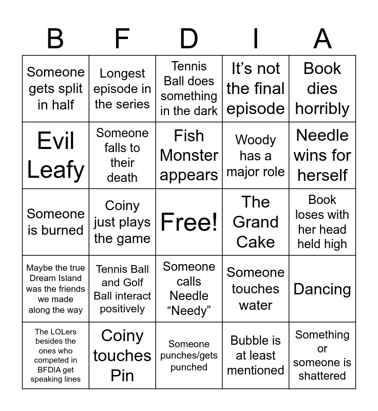This bingo card has a free space and 24 words: Tennis Ball and Golf Ball interact positively, Coiny touches Pin, Fish Monster appears, The LOLers besides the ones who competed in BFDIA get speaking lines, Book dies horribly, Someone gets split in half, Evil Leafy, Longest episode in the series, The Grand Cake, Someone calls Needle “Needy”, Woody has a major role, Someone is burned, Someone touches water, Dancing, Someone falls to their death, Bubble is at least mentioned, Book loses with her head held high, Tennis Ball does something in the dark, Needle wins for herself, Coiny just plays the game, Something or someone is shattered, Maybe the true Dream Island was the friends we made along the way, It’s not the final episode and Someone punches/gets punched.