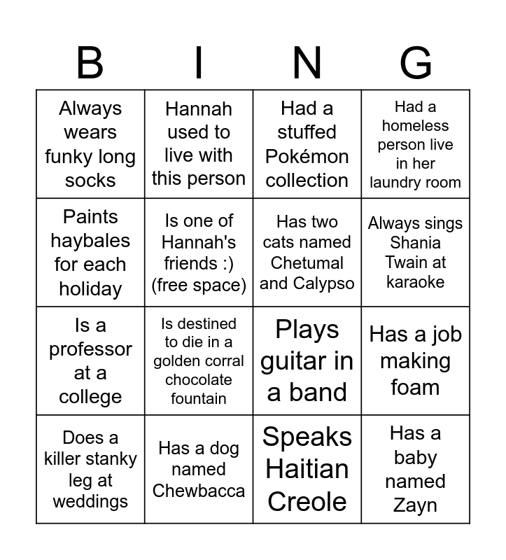 This bingo card has 16 words: Has a dog named Chewbacca, Has a job making foam, Had a stuffed Pokémon collection, Always wears funky long socks, Is a professor at a college, Hannah used to live with this person, Plays guitar in a band, Speaks Haitian Creole, Paints haybales for each holiday, Is one of Hannah's friends :) (free space), Does a killer stanky leg at weddings, Had a homeless person live in her laundry room, Is destined to die in a golden corral chocolate fountain, Always sings Shania Twain at karaoke, Has two cats named Chetumal and Calypso and Has a baby named Zayn.