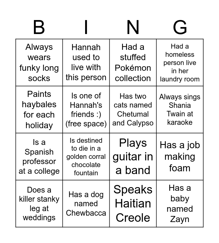 This bingo card has 16 words: Has a dog named Chewbacca, Has a job making foam, Had a stuffed Pokémon collection, Always wears funky long socks, Is a Spanish professor at a college, Hannah used to live with this person, Plays guitar in a band, Speaks Haitian Creole, Paints haybales for each holiday, Is one of Hannah's friends :) (free space), Does a killer stanky leg at weddings, Had a homeless person live in her laundry room, Is destined to die in a golden corral chocolate fountain, Always sings Shania Twain at karaoke, Has two cats named Chetumal and Calypso and Has a baby named Zayn.