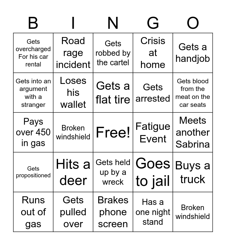 This bingo card has a free space and 24 words: Hits a deer, Gets pulled over, Gets a flat tire, Runs out of gas, Gets a handjob, Gets overcharged For his car rental, Gets into an argument with a stranger, Road rage incident, Fatigue Event, Gets held up by a wreck, Gets arrested, Pays over 450 in gas, Goes to jail, Buys a truck, Loses his wallet, Has a one night stand, Meets another Sabrina, Gets robbed by the cartel, Gets blood from the meat on the car seats, Broken windshield, Broken windshield, Gets propositioned, Crisis at home and Brakes phone screen.