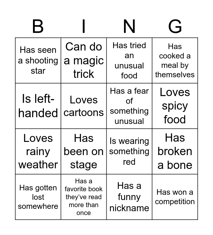 This bingo card has 26 words: Free!, Has been on a plane, Loves spicy food, Plays an instrument, Is left-handed, Has seen a shooting star, Loves cartoons, Can do a magic trick, Has a funny nickname, Has lived in another city, Loves rainy weather, Is wearing something red, Has a birthday this month, Has a pet, Has broken a bone, Has met someone famous, Has cooked a meal by themselves, Has won a competition, Has tried an unusual food, Has gotten lost somewhere, Has been on stage, Has done something they are proud of recently, Has a favorite book they’ve read more than once, Has learned a new skill recently, Has a fear of something unusual and Has had a really funny misunderstanding.