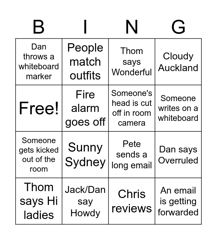 This bingo card has 16 words: Jack/Dan say Howdy, Dan says Overruled, Thom says Wonderful, Dan throws a whiteboard marker, Someone gets kicked out of the room, People match outfits, Pete sends a long email, Chris reviews, Free!, Fire alarm goes off, Thom says Hi ladies, Cloudy Auckland, Sunny Sydney, Someone writes on a whiteboard, Someone's head is cut off in room camera and An email is getting forwarded.