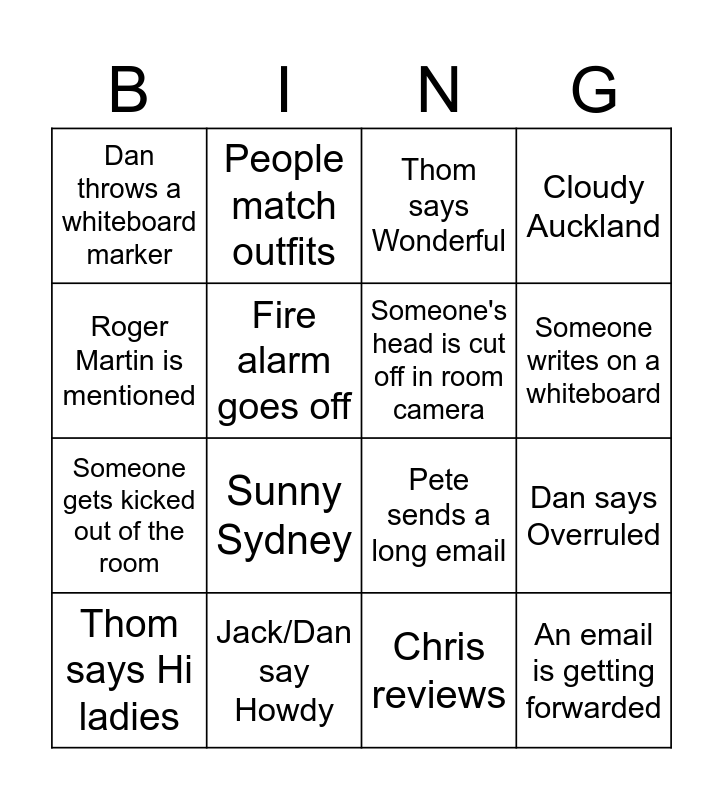This bingo card has 16 words: Jack/Dan say Howdy, Dan says Overruled, Thom says Wonderful, Dan throws a whiteboard marker, Someone gets kicked out of the room, People match outfits, Pete sends a long email, Chris reviews, Roger Martin is mentioned, Fire alarm goes off, Thom says Hi ladies, Cloudy Auckland, Sunny Sydney, Someone writes on a whiteboard, Someone's head is cut off in room camera and An email is getting forwarded.