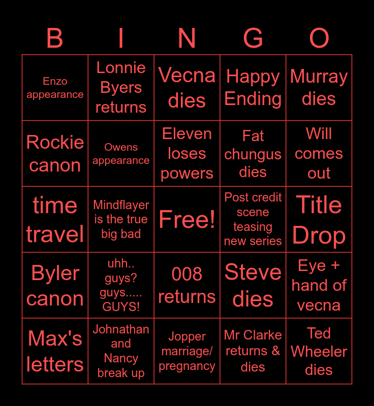 This bingo card has a free space and 24 words: uhh.. guys? guys..... GUYS!, Johnathan and Nancy break up, Eleven loses powers, Max's letters, Murray dies, Enzo appearance, Rockie canon, Lonnie Byers returns, Post credit scene teasing new series, 008 returns, Fat chungus dies, time travel, Steve dies, Eye + hand of vecna, Owens appearance, Mr Clarke returns & dies, Title Drop, Vecna dies, Will comes out, Mindflayer is the true big bad, Ted Wheeler dies, Byler canon, Happy Ending and Jopper marriage/ pregnancy.