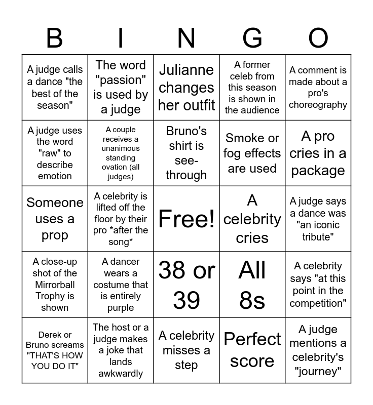 This bingo card has a free space and 24 words: A dancer wears a costume that is entirely purple, The host or a judge makes a joke that lands awkwardly, Bruno's shirt is see-through, Derek or Bruno screams "THAT'S HOW YOU DO IT", A comment is made about a pro's choreography, A judge calls a dance "the best of the season", A judge uses the word "raw" to describe emotion, The word "passion" is used by a judge, A celebrity cries, 38 or 39, Smoke or fog effects are used, Someone uses a prop, All 8s, A celebrity says "at this point in the competition", A couple receives a unanimous standing ovation (all judges), Perfect score, A judge says a dance was "an iconic tribute", Julianne changes her outfit, A pro cries in a package, A celebrity is lifted off the floor by their pro *after the song*, A judge mentions a celebrity's "journey", A close-up shot of the Mirrorball Trophy is shown, A former celeb from this season is shown in the audience and A celebrity misses a step.