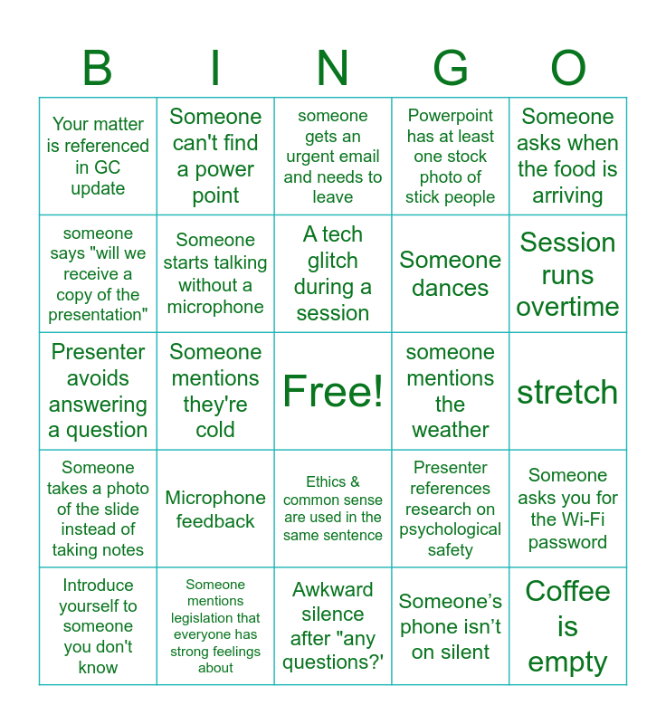 This bingo card has a free space and 26 words: Ethics & common sense are used in the same sentence, Someone’s phone isn’t on silent, A tech glitch during a session, Someone mentions legislation that everyone has strong feelings about, Someone asks when the food is arriving, Your matter is referenced in GC update, someone says "will we receive a copy of the presentation", Someone can't find a power point, stretch, Presenter references research on psychological safety, Someone dances, Presenter avoids answering a question, Someone asks you for the Wi-Fi password, Introduce yourself to someone you don't know, Someone mentions they're cold, "We'll need more training on that" is said, Powerpoint has at least one stock photo of stick people, Someone takes a photo of the slide instead of taking notes, someone gets an urgent email and needs to leave, Coffee is empty, Session runs overtime, Awkward silence after "any questions?', someone mentions the weather, Microphone feedback, Someone starts talking without a microphone and Someone brings up the lack of attorneys.