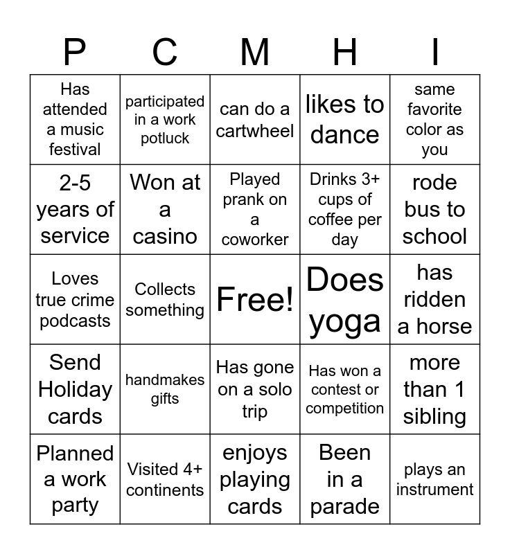 This bingo card has a free space and 24 words: handmakes gifts, Visited 4+ continents, Played prank on a coworker, Planned a work party, same favorite color as you, Has attended a music festival, 2-5 years of service, participated in a work potluck, Does yoga, Has gone on a solo trip, Drinks 3+ cups of coffee per day, Loves true crime podcasts, Has won a contest or competition, more than 1 sibling, Won at a casino, Been in a parade, has ridden a horse, can do a cartwheel, rode bus to school, Collects something, plays an instrument, Send Holiday cards, likes to dance and enjoys playing cards.