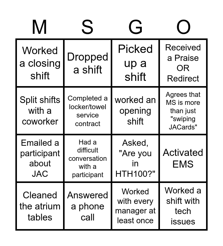 This bingo card has 20 words: Activated EMS, Directed a participant to a location, Picked up a shift, Filled out a damaged equip. form, Cleaned the atrium tables, Split shifts with a coworker, Answered a phone call, Worked a closing shift, Emailed a participant about JAC, Dropped a shift, Had a difficult conversation with a participant, Asked, "Are you in HTH100?", Completed a locker/towel service contract, Worked a shift with tech issues, worked an opening shift, Processed a guest pass, Agrees that MS is more than just "swiping JACards", Received a Praise OR Redirect, Worked with every manager at least once and Attended a D3.