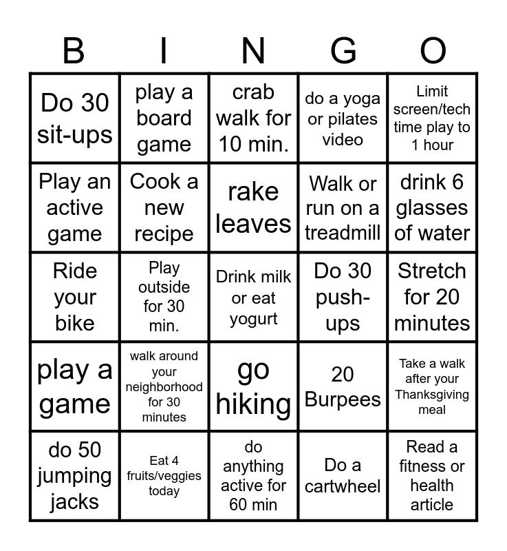 This bingo card has a free space and 24 words: walk around your neighborhood for 30 minutes, Eat 4 fruits/veggies today, rake leaves, do 50 jumping jacks, Limit screen/tech time play to 1 hour, Do 30 sit-ups, Play an active game, play a board game, Do 30 push-ups, go hiking, Walk or run on a treadmill, Ride your bike, 20 Burpees, Take a walk after your Thanksgiving meal, Cook a new recipe, Do a cartwheel, Stretch for 20 minutes, crab walk for 10 min., drink 6 glasses of water, Play outside for 30 min., Read a fitness or health article, play a game, do a yoga or pilates video and do anything active for 60 min.