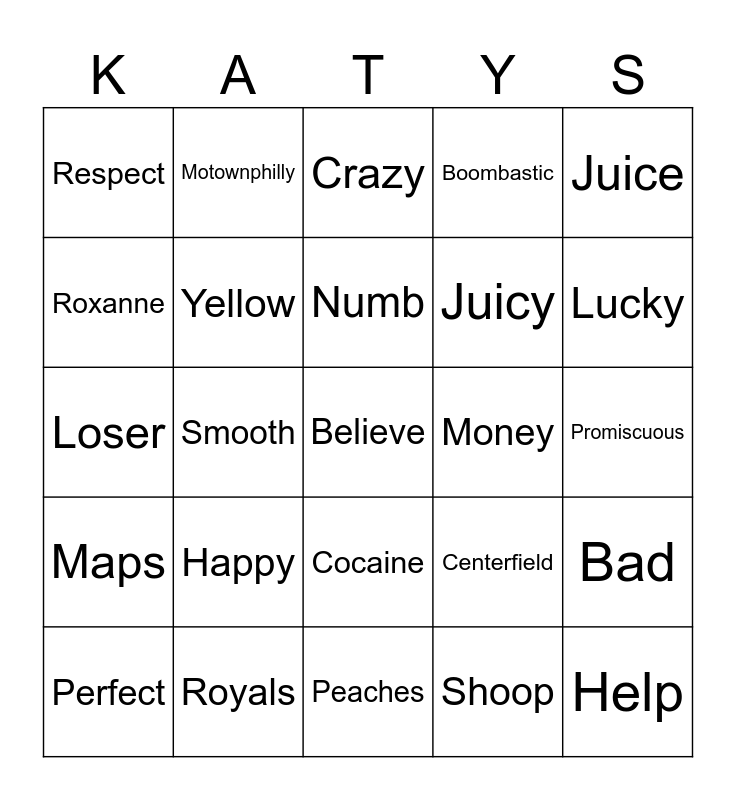 This bingo card has 36 words: Jump, Wannabe, Halo, Yellow, Centerfield, Maps, Numb, Africa, Juice, Tequila, Smooth, Boombastic, Rhiannon, Money, Lucky, Respect, Help, Happy, Believe, Crazy, Promiscuous, Bad, Royals, Perfect, Peaches, Motownphilly, Loser, Sabotage, Juicy, Roxanne, Layla, Jolene, Shoop, Cocaine, Fireflies and Apache.