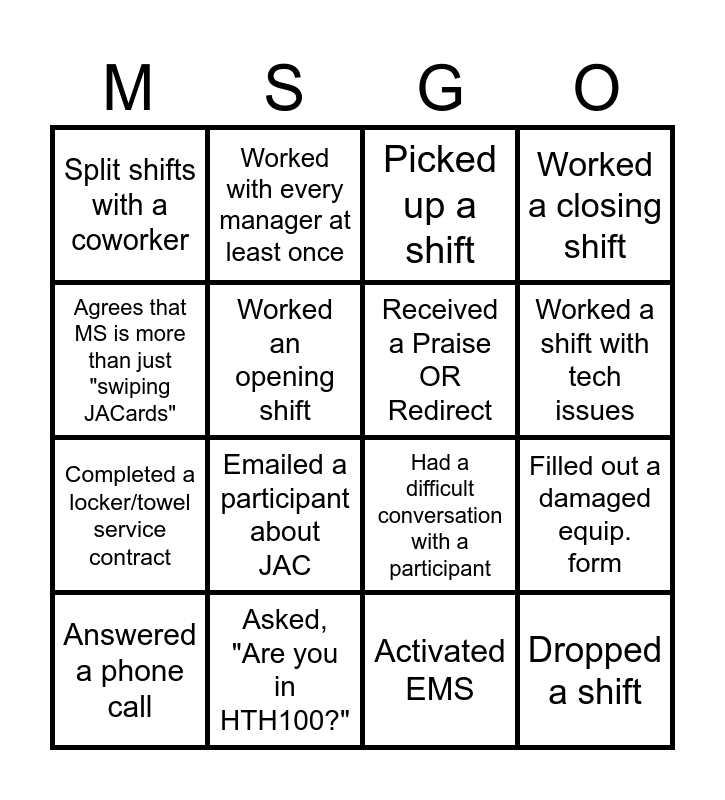 This bingo card has 20 words: Answered a phone call, Directed a participant to a location, Picked up a shift, Filled out a damaged equip. form, Processed a guest pass, Emailed a participant about JAC, Activated EMS, Worked a closing shift, Completed a locker/towel service contract, Worked with every manager at least once, Had a difficult conversation with a participant, Worked a shift with tech issues, Split shifts with a coworker, Asked, "Are you in HTH100?", Received a Praise OR Redirect, Cleaned the atrium tables, Agrees that MS is more than just "swiping JACards", Worked an opening shift, Attended a D3 and Dropped a shift.