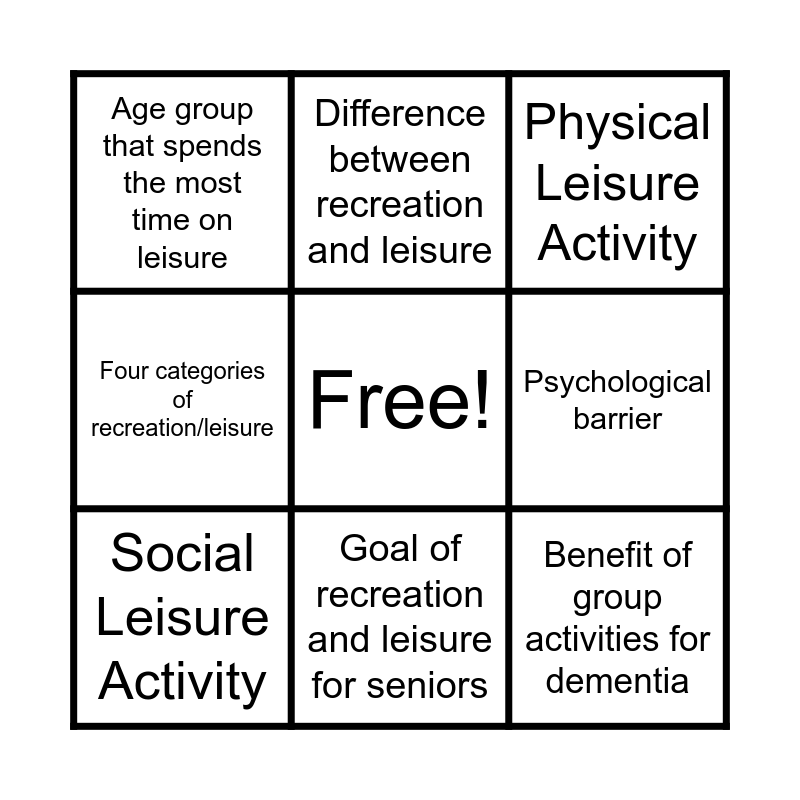This bingo card has a free space and 9 words: Social Leisure Activity, Physical Leisure Activity, Difference between recreation and leisure, Four categories of recreation/leisure, Age group that spends the most time on leisure, Psychological barrier, Benefit of group activities for dementia, High-SES opportunity and Goal of recreation and leisure for seniors.