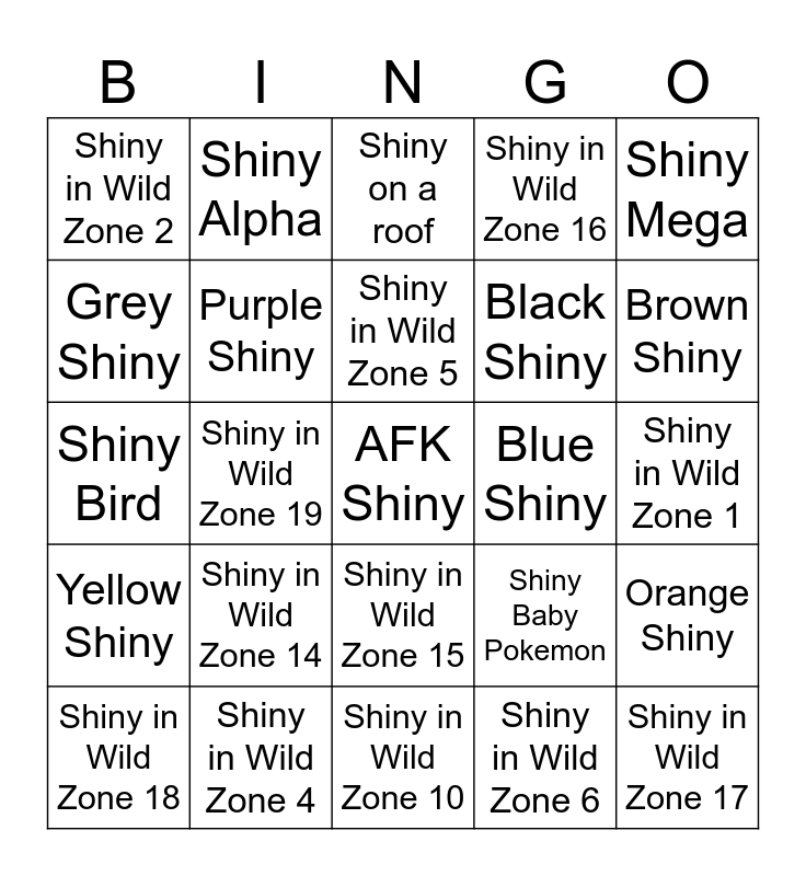 This bingo card has 38 words: Pink Shiny, Red Shiny, Green Shiny, Blue Shiny, Orange Shiny, Yellow Shiny, Purple Shiny, White Shiny, Black Shiny, Brown Shiny, Grey Shiny, Shiny Alpha, AFK Shiny, Shiny Baby Pokemon, Shiny Mega, Shiny Bird, Shiny Bug, Shiny on a roof, Shiny in the streets, Shiny in Wild Zone 1, Shiny in Wild Zone 2, Shiny in Wild Zone 4, Shiny in Wild Zone 5, Shiny in Wild Zone 6, Shiny in Wild Zone 7, Shiny in Wild Zone 8, Shiny in Wild Zone 9, Shiny in Wild Zone 10, Shiny in Wild Zone 11, Shiny in Wild Zone 12, Shiny in Wild Zone 13, Shiny in Wild Zone 14, Shiny in Wild Zone 15, Shiny in Wild Zone 16, Shiny in Wild Zone 17, Shiny in Wild Zone 18, Shiny in Wild Zone 19 and Shiny in Wild Zone 20.