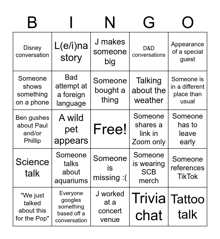 This bingo card has a free space and 49 words: Someone is crafting, Tattoo talk, Show and tell, J worked at a concert venue, Someone talks about aquariums, Tuesday Paul story, L(e/i)na story, Someone drinks, Someone shows something on a phone, Castlecon, Bad attempt at a foreign language, D&D conversations, Someone references TikTok, Someone is wearing SCB merch, Harry Potter Talk, Spartan Race, Someone bought a thing, Someone shares a link in Zoom only, Technical difficulties, Appearance of a special guest, A wild pet appears, Trivia chat, Disney conversation, Talking about the weather, Talking about tv shows/movies, Someone is in a different place than usual, "We just talked about this for the Pop", Someone changes their appearance, Someone is missing :(, Science talk, Reference to an SCB video, Someone new/different joins the call, Talking about books, More than 3 hangout chatters in Youtube chat, Everyone googles something based off a conversation, Metric-Imperial Conversions, Someone shares a story about their kids, Someone is late, Someone has to leave early, Somebody forces a square, Reference to a previous Hangout Call, Talking about music, TTGD Talk, Someone yells BINGO!, Ben gushes about Paul and/or Phillip, J makes someone big, Someone makes Dola feel old, Krista gets asked about the Forklift and "What's your favorite herb?".