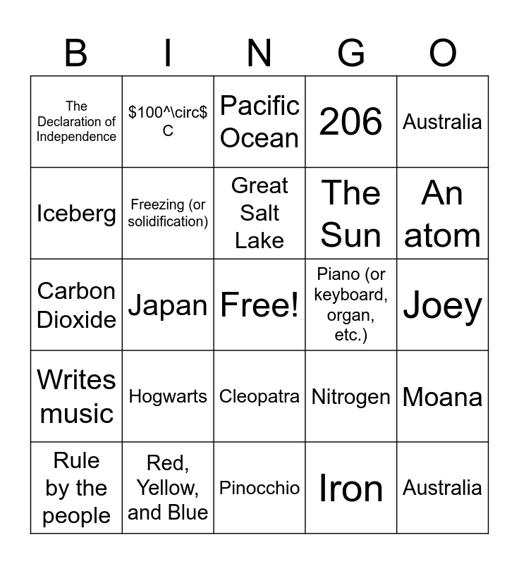 This bingo card has a free space and 75 words: Paris, South America, Pacific Ocean, China, Mount Everest, California, Panama Canal, Hot, Italy, Tokyo, Africa, Canada and the United States, Great Salt Lake, Iceberg, Africa, Japan, Red and White, Australia, Mediterranean Sea, Australia, Mars, Carbon Dioxide, Freezing (or solidification), $100^\circ$ C, 206, Gravity, Albert Einstein, A frog (it's an amphibian), Skin, Its ears (echolocation), Au, Chlorophyll, Ozone layer, Nitrogen, An atom, The Sun, False (Light is much faster), Arteries, Joey, Iron, Cat, George Washington, World War II, Ancient Egyptians, Thomas Edison, 1912, Rule by the people, The Declaration of Independence, Mahatma Gandhi, The Civil War, The Israelites (or Hebrews), Cleopatra, Julius Caesar, The Mayflower, The Statue of Liberty, Anne Frank, The title of a ruler of Russia (before 1917), Martin Luther King Jr., The Printing Press, The Bill of Rights, Hogwarts, Roald Dahl, Leonardo da Vinci, A three-line poem with a 5-7-5 syllable structure, The Ring (his "Precious"), Piano (or keyboard, organ, etc.), Gotham City, Nana (the dog), The Hunger Games, Moana, Writes music, Red, Yellow, and Blue, William Shakespeare, Pinocchio and Poetry.