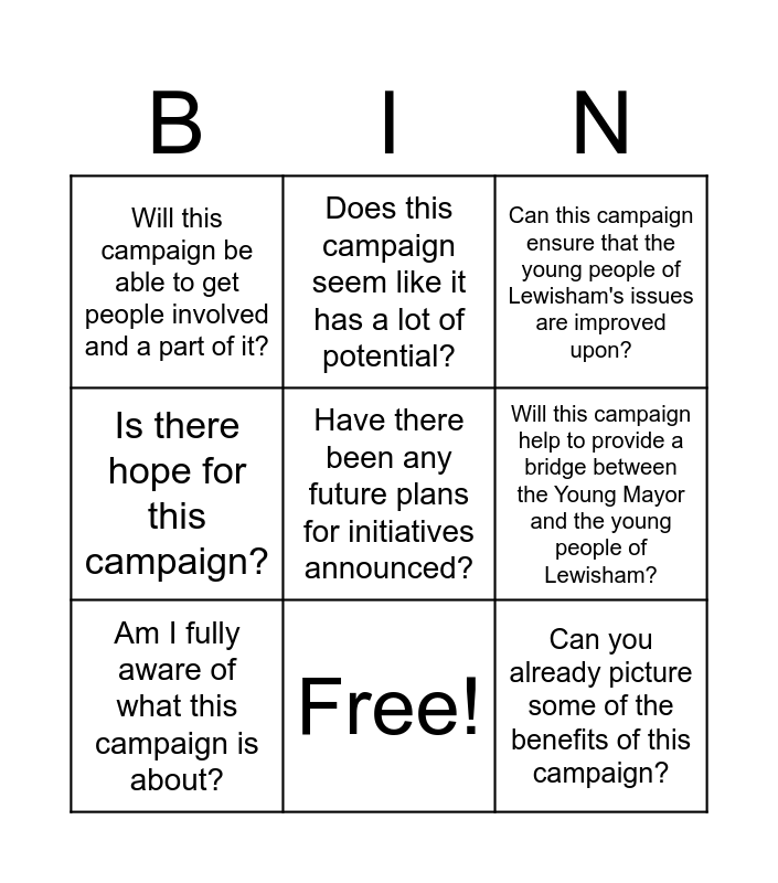 This bingo card has 10 words: Free!, Can this campaign ensure that the young people of Lewisham's issues are improved upon?, Will this campaign be able to get people involved and a part of it?, Have there been any future plans for initiatives announced?, Is there hope for this campaign?, Am I fully aware of what this campaign is about?, Does this campaign seem like it has a lot of potential?, Can this campaign reach the attention of lots of people?, Will this campaign help to provide a bridge between the Young Mayor and the young people of Lewisham? and Can you already picture some of the benefits of this campaign?.