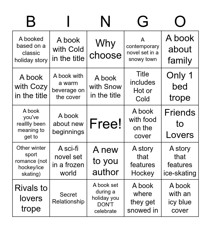 This bingo card has a free space and 51 words: A book with a snowy landscape on the cover, A book with an icy blue cover, A book set during a holiday you celebrate, A book set during a holiday you DON'T celebrate, A sci-fi novel set in a frozen world, A fantasy novel set in a snow/winter kingdom, A book with Cold in the title, A book with Frozen in the title, A book with Cozy in the title, A book featuring a fireplace on the cover, A book with a warm beverage on the cover, A contemporary novel set in a snowy town, A story that features ice-skating, A story that features Hockey, book set in a winter resort, A book with Ice or Frost as a major symbol or element, A book with Snow in the title, A book with food on the cover, A book set in a cabin, A book about family, A book about new beginnings, A book where they get snowed in, A booked based on a classic holiday story, Title includes Hot or Cold, A book that came out in December, A book that came out in November, Only 1 bed trope, Enemies to lovers trope, Rivals to lovers trope, Why choose, Omegaverse, Fake dating trope, Grumpy/sunshine, Stuck together trope, Fated mates, Secret Relationship, MLM Relationship, WLW Relationship, LGBTQ Relationship, Reunion/ 2nd Chance, Friends to Lovers, Other winter sport romance (not hockey/ice skating), A book you own, A book you borrowed, A book that completes a reading challenge, A book you've owned for a while, A book you've realllly been meaning to get to, A book recommended by a friend, A book we read previously for book club, A new to you author and A return to an author you like.