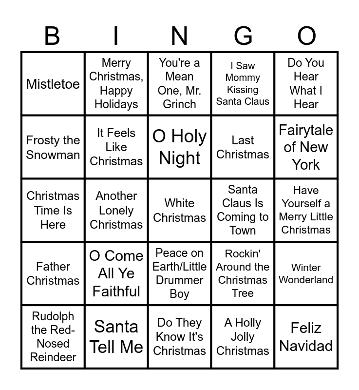This bingo card has 37 words: Free!, Baby It's Cold Outside, My Only Wish (This Year), It Feels Like Christmas, Winter Wonderland, O Come All Ye Faithful, O Holy Night, Christmas (Baby Please Come Home), Do You Hear What I Hear, It's Beginning to Look a Lot Like Christmas, Another Lonely Christmas, I Saw Mommy Kissing Santa Claus, White Christmas, Have Yourself a Merry Little Christmas, Frosty the Snowman, Father Christmas, Let It Snow! Let It Snow! Let It Snow!, You're a Mean One, Mr. Grinch, Peace on Earth/Little Drummer Boy, Santa Claus Is Coming to Town, Mistletoe, Fairytale of New York, Rudolph the Red-Nosed Reindeer, Do They Know It's Christmas, Underneath the Tree, A Holly Jolly Christmas, Merry Christmas, Happy Holidays, Santa Baby, Jingle Bell Rock, Christmas Wrapping, It's the Most Wonderful Time of the Year, Santa Tell Me, Christmas Time Is Here, Feliz Navidad, Rockin' Around the Christmas Tree, Last Christmas and All I Want For Christmas Is You.