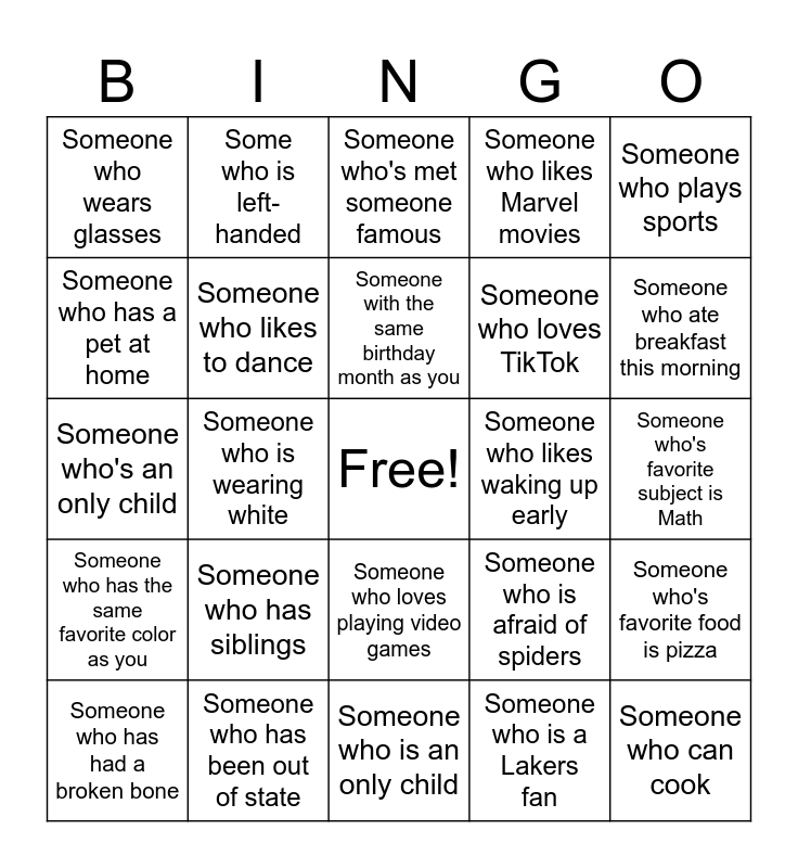 This bingo card has a free space and 24 words: Someone who has siblings, Someone who has been out of state, Someone with the same birthday month as you, Someone who has had a broken bone, Someone who plays sports, Someone who wears glasses, Someone who has a pet at home, Some who is left-handed, Someone who likes waking up early, Someone who loves playing video games, Someone who loves TikTok, Someone who's an only child, Someone who is afraid of spiders, Someone who's favorite food is pizza, Someone who likes to dance, Someone who is a Lakers fan, Someone who's favorite subject is Math, Someone who's met someone famous, Someone who ate breakfast this morning, Someone who is wearing white, Someone who can cook, Someone who has the same favorite color as you, Someone who likes Marvel movies and Someone who is an only child.