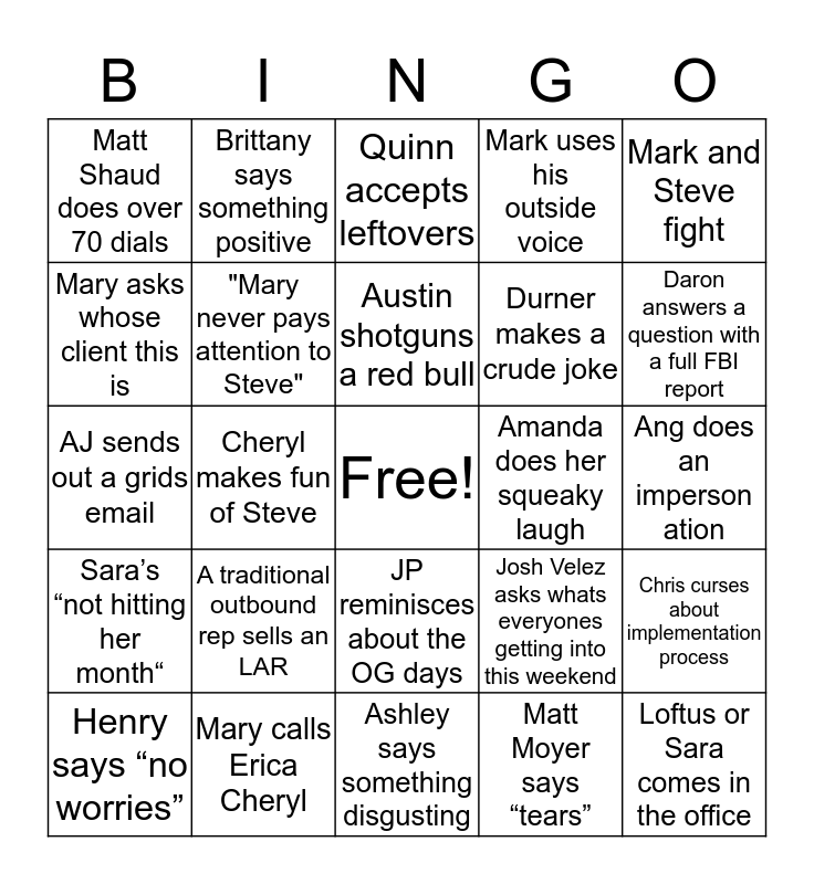 This bingo card has a free space and 24 words: A traditional outbound rep sells an LAR, Mary calls Erica Cheryl, Austin shotguns a red bull, Henry says “no worries”, Mark and Steve fight, Matt Shaud does over 70 dials, Mary asks whose client this is, Brittany says something positive, Amanda does her squeaky laugh, JP reminisces about the OG days, Durner makes a crude joke, AJ sends out a grids email, Josh Velez asks whats everyones getting into this weekend, Chris curses about implementation process, "Mary never pays attention to Steve", Matt Moyer says “tears”, Ang does an imperson ation, Quinn accepts leftovers, Daron answers a question with a full FBI report, Cheryl makes fun of Steve, Loftus or Sara comes in the office, Sara’s “not hitting her month“, Mark uses his outside voice and Ashley says something disgusting.
