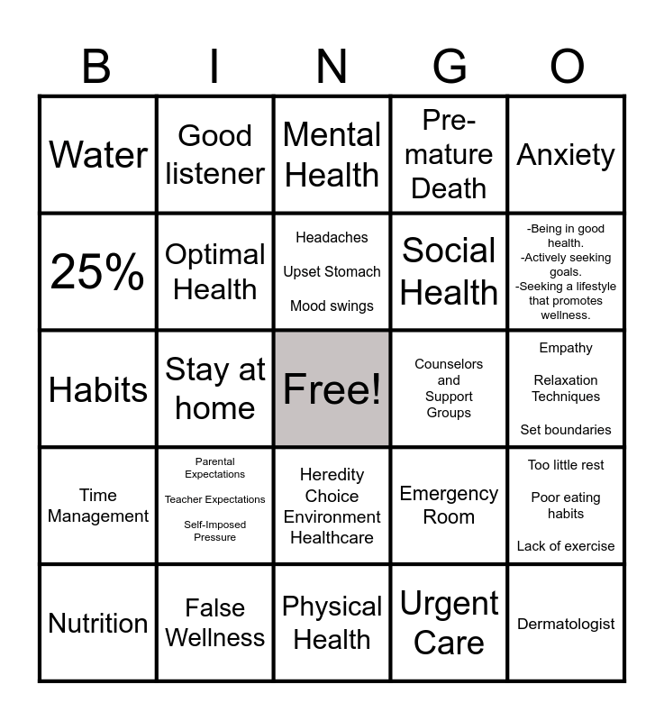 This bingo card has a free space and 26 words: Physical Mental Social, Parental Expectations Teacher Expectations Self-Imposed Pressure, Physical Health, Urgent Care, -Being in good health. -Actively seeking goals. -Seeking a lifestyle that promotes wellness., Water, Good listener, Mental Health, Social Health, Too little rest Poor eating habits Lack of exercise, Habits, Stay at home, Emergency Room, Dermatologist, Time Management, False Wellness, Headaches Upset Stomach Mood swings, Counselors and Support Groups, Anxiety, Nutrition, Optimal Health, Heredity Choice Environment Healthcare, Pre-mature Death, Empathy Relaxation Techniques Set boundaries, 25% and 75%.