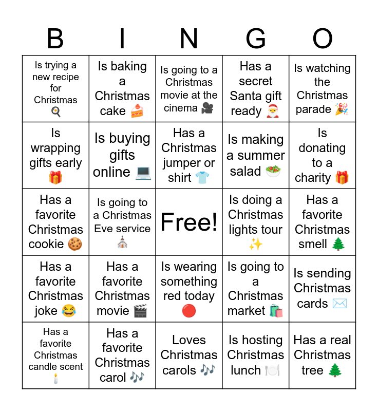 This bingo card has a free space and 50 words: Has already put up their Christmas tree 🎄, Has a real Christmas tree 🌲, Has a fake Christmas tree 🎄, Loves Christmas carols 🎶, Has a favorite Christmas movie 🎬, Is baking gingerbread cookies 🍪, Is baking a Christmas cake 🍰, Is making a pavlova 🍰, Is wrapping gifts early 🎁, Has bought all their gifts already 🎁, Is buying gifts online 💻, Has a secret Santa gift ready 🎅, Is sending Christmas cards ✉️, Is going to a Christmas market 🛍️, Has made homemade decorations ✂️, Is going to a Christmas concert 🎤, Has a Christmas jumper or shirt 👕, Is doing a Christmas lights tour ✨, Is leaving milk and cookies for Santa 🍪🥛, Is watching the Christmas parade 🎉, Is going to a Christmas Eve service ⛪, Is hosting Christmas lunch 🍽️, Is trying a new recipe for Christmas 🍳, Is making a summer salad 🥗, Is planning a Christmas BBQ 🍖, Is volunteering this Christmas ❤️, Is donating to a charity 🎁, Has a holiday playlist ready 🎵, Is going to a Christmas movie at the cinema 🎥, Is wearing something red today 🔴, Is wearing something green today 🟢, Has a favorite Christmas dessert 🍨, Has a favorite Christmas drink 🍷, Has a favorite Christmas tradition 🎄, Has a favorite Christmas carol 🎶, Has a favorite Christmas memory ❤️, Has a favorite Christmas decoration ✨, Has a favorite Christmas food 🍗, Has a favorite Christmas gift 🎁, Has a favorite Christmas smell 🌲, Has a favorite Christmas color 🎨, Has a favorite Christmas movie quote 🎬, Has a favorite Christmas song lyric 🎵, Has a favorite Christmas ornament 🎄, Has a favorite Christmas candle scent 🕯️, Has a favorite Christmas cookie 🍪, Has a favorite Christmas drink recipe 🍹, Has a favorite Christmas game 🎲, Has a favorite Christmas joke 😂 and Has a favorite Christmas emoji 🎅.