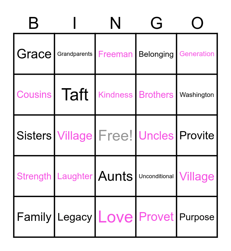 This bingo card has a free space and 24 words: Laughter, Legacy, Kindness, Family, Generation, Grace, Cousins, Grandparents, Uncles, Aunts, Brothers, Sisters, Unconditional, Village, Taft, Provet, Provite, Freeman, Washington, Village, Purpose, Strength, Belonging and Love.